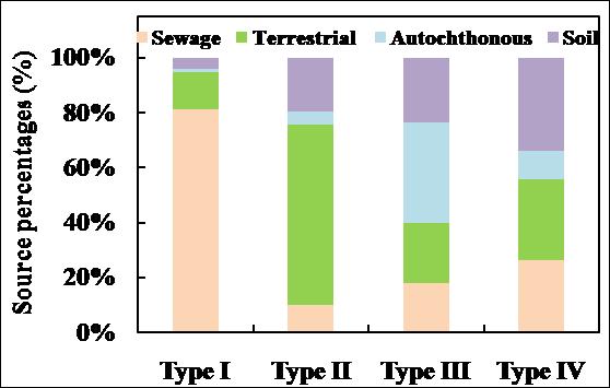 河流水體DOC的來源主要包括內源和外源2個部分,土壤有機質的侵蝕、陸生植物殘體以及人類生產、生活活動排放的有機物等是外源有機碳的主要來源;而內源DOC主要源于河流中植物葉綠體光合作用、細菌及其分泌物等。中國海河流域工農業發展迅速,河流水體污染現象嚴重,中國科學院東北地理與農業生態研究所水環境遙感學科組的科研人員對海河流域水體進行了野外調查采樣,基于三維熒光技術和穩定同位素分析技術解析了河流水體中DOC來源:1)受蒸發作用影響,海河流域河水中春季DOC濃度明顯高于秋季(p < 0.01),但春季DOC中陸源組分比例明顯低于秋季;2)海河流域河流水體中DOC主要來源于陸源物質,主要包括生活污水(9.8%-81.2%)和陸生植物殘體(13.3%-65.8%);3)按照海河流域河水中DOC的主要來源可將河水分為4個類型:I型河水,DOC主要來自生活污水(81.2%);II型河水,DOC主要來自陸生植物殘體(65.8%);III型河水,DOC主要來自土壤有機質(36.4%);IV型河水,DOC主要來自浮游生物(33.9%)(圖1)。本研究結果進一步掌握了河流水體中有機碳的組成、含量及來源等,有助于加深對河流水體有機碳循環生物地球化學過程的理解,為進一步開展河流水體有機碳循環研究工作奠定堅實基礎。