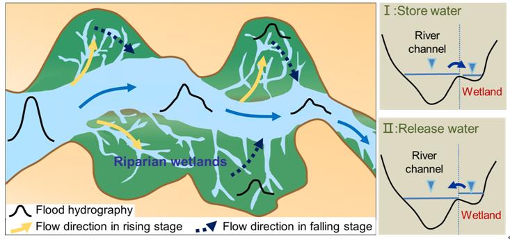 圖2 河濱濕地對(duì)洪水過程的影響機(jī)制