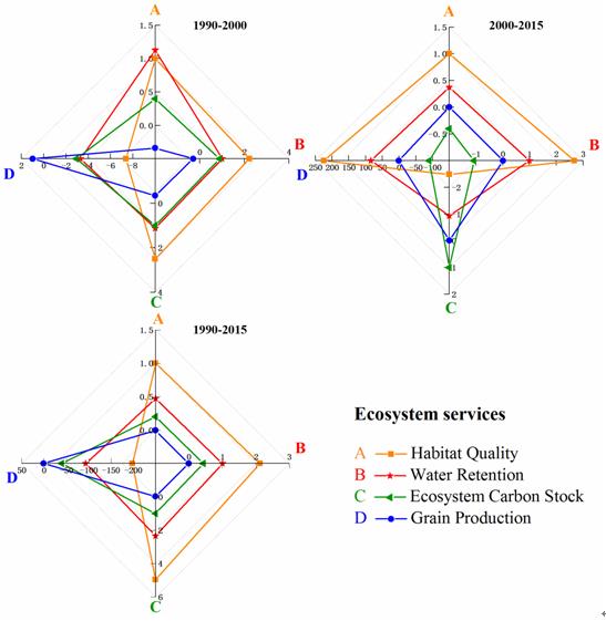 地理景觀遙感學科組研究人員結合野外調查采樣數據,通過Landsat系列影像和InVEST模型,以三江平原這一國家濕地保護工程實施的重點區域作為研究區,對比分析了1990-2000年和2000-2015年期間整個三江平原及區域內9個國家級濕地保護區的土地覆被和生態系統服務能力的變化,解析了國家濕地保護工程的實施成效。研究發現:國家濕地保護工程在減緩濕地損失和提升區域生態系統服務方面扮演了重要的角色。工程實施后,三江平原的濕地損失率明顯下降。2000-2015年相比于1990-2000年,區域生境適宜性良好的面積和生態系統碳儲量減少率明顯下降,區域水源涵養能力和食物生產能力明顯提升。9個國家級濕地保護區起到了重要作用。