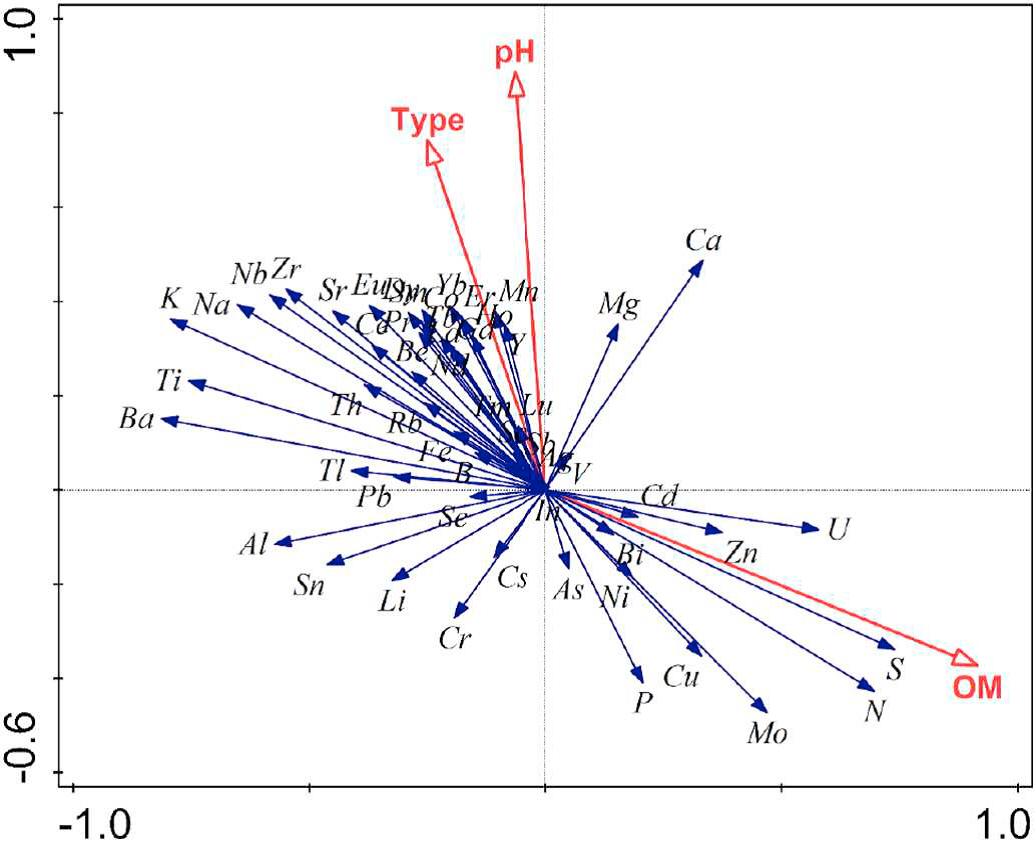 圖1 土壤元素組成與約束環(huán)境變量的RDA排序圖