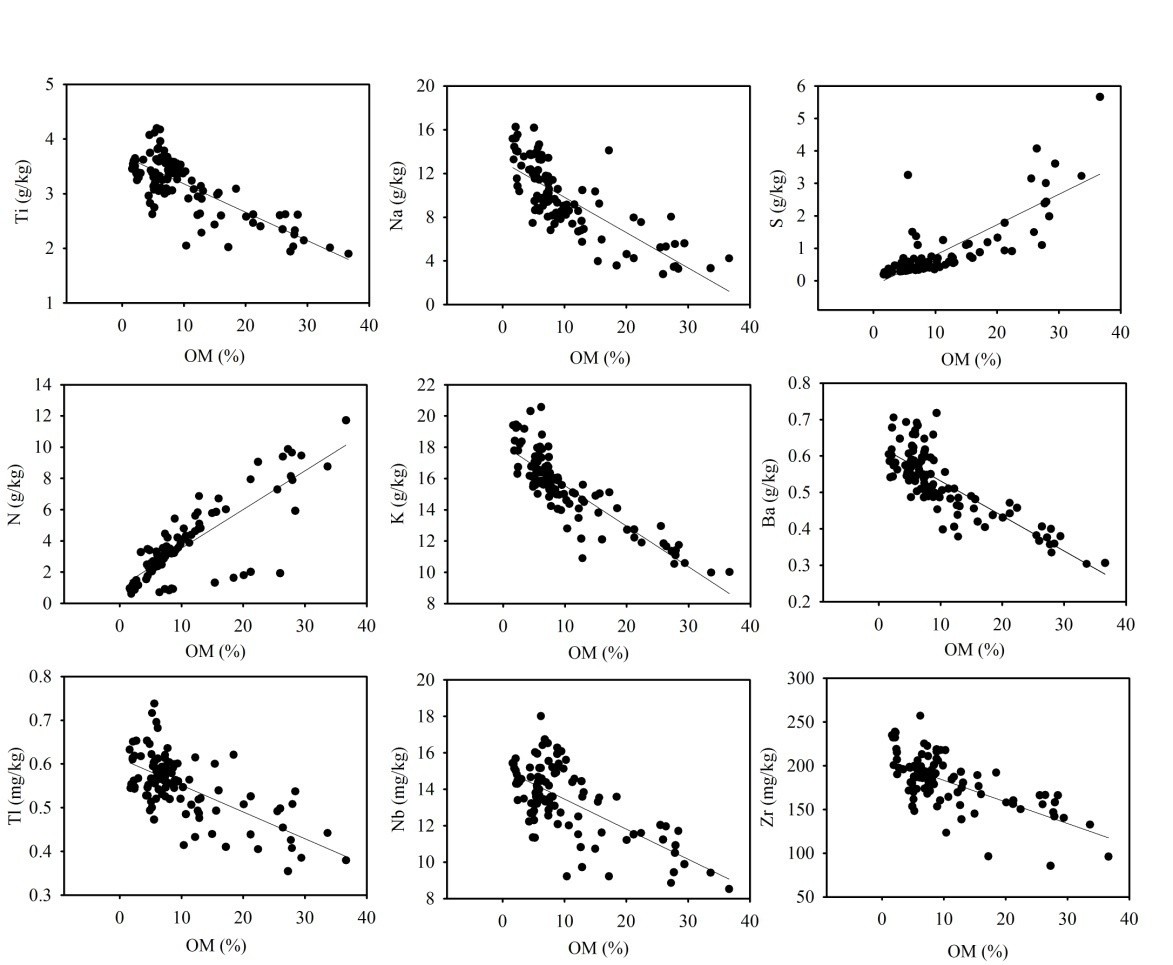 圖2 土壤元素含量與土壤有機質(zhì)含量的相關(guān)性