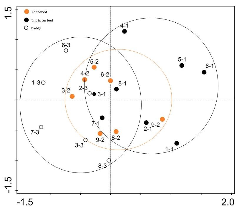 圖3 基于Bray-Curtis算法的樣地(天然濕地、恢復(fù)濕地、開墾農(nóng)田)NMDS排序圖