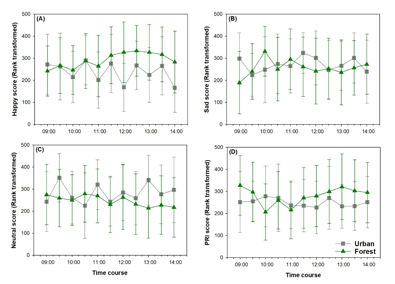 圖2. 參與者面部開心(A)、悲傷(B)、木訥(C)和樂觀積極表情(B)的秩排序動態在城市森林與附近街區之間的差別。