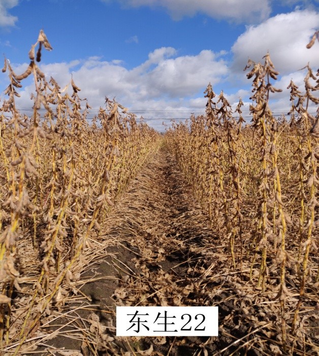 “東生22 ”為高蛋白、高產(chǎn)量品種。 “東生22 ”三年平均品質(zhì)分析結(jié)果蛋白質(zhì)含量43.80 %,脂肪含量 19.55 %;生產(chǎn)試驗平均公頃產(chǎn)量 2605.2公斤,較對照品種北豆40增產(chǎn)7.9%。中抗灰斑病。“東生22 ”為亞有限結(jié)莢習(xí)性。株高85厘米左右,無分枝,白花,長葉,灰色茸毛,莢彎鐮形,成熟時呈灰褐色。籽粒圓形,種皮黃色,種臍黃色,有光澤,百粒重20.0克左右。適宜在黑龍江省第三積溫帶西部區(qū)≥10℃活動積溫2350℃區(qū)域種植。
