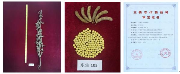 “東生105”(審定編號:吉審豆20200032)為高產、廣適大豆新品種。該品種以吉育47為父本,廣適性EMS誘變篩選的突變材料SEJ0086為母本。利用分子設計育種技術,通過聚合高產基因和廣適性基因選育而成。區域試驗平均公頃產量2904.30公斤,比對照組吉育86增產7.41%;2019年生產試驗平均公頃產量2926.61公斤,比對照組吉育86增產9.33%,多年多點種植穩定性極好。亞有限結莢習性,平均株高96.8厘米,主莖型結莢,主莖節數18個,三粒莢多,莢熟時呈褐色,平均百粒重22.7克。經人工接種鑒定,高抗大豆花葉病毒1號株系,高抗大豆花葉病毒3號株系,中抗大豆灰斑病,抗大豆褐斑病,高抗大豆霜霉病。籽粒粗蛋白質含量39.32%,粗脂肪含量20.22%。