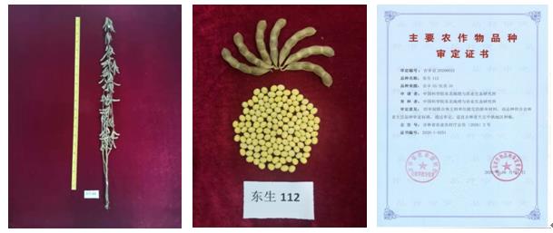 “東生112”(審定編號:吉審豆20200033)為高產、多抗大豆新品種。該品種以長農16為父本,合豐55為母本。利用分子設計育種技術,通過聚合高產基因和抗花葉病毒、抗霜霉病、抗灰斑病等多個抗病基因選育而成。區域試驗平均公頃產量2931.90公斤,比對照組吉育86增產8.44%;2019年生產試驗平均公頃產量2843.43公斤,比對照吉育組86增產6.22%。亞有限結莢習性,平均株高101.4厘米,主莖型結莢,主莖節數17個,三粒莢多,莢熟時呈褐色。圓形葉、白花、灰毛,籽粒圓形,種皮黃色,有微光澤,種臍黃色,平均百粒重18.9克。經人工接種鑒定,高抗大豆花葉病毒1號株系,高抗大豆花葉病毒3號株系,抗大豆灰斑病,抗大豆褐斑病,高抗大豆霜霉病,中抗大豆細菌性斑點病。籽粒粗蛋白質含量41.88%,粗脂肪含量19.47%。