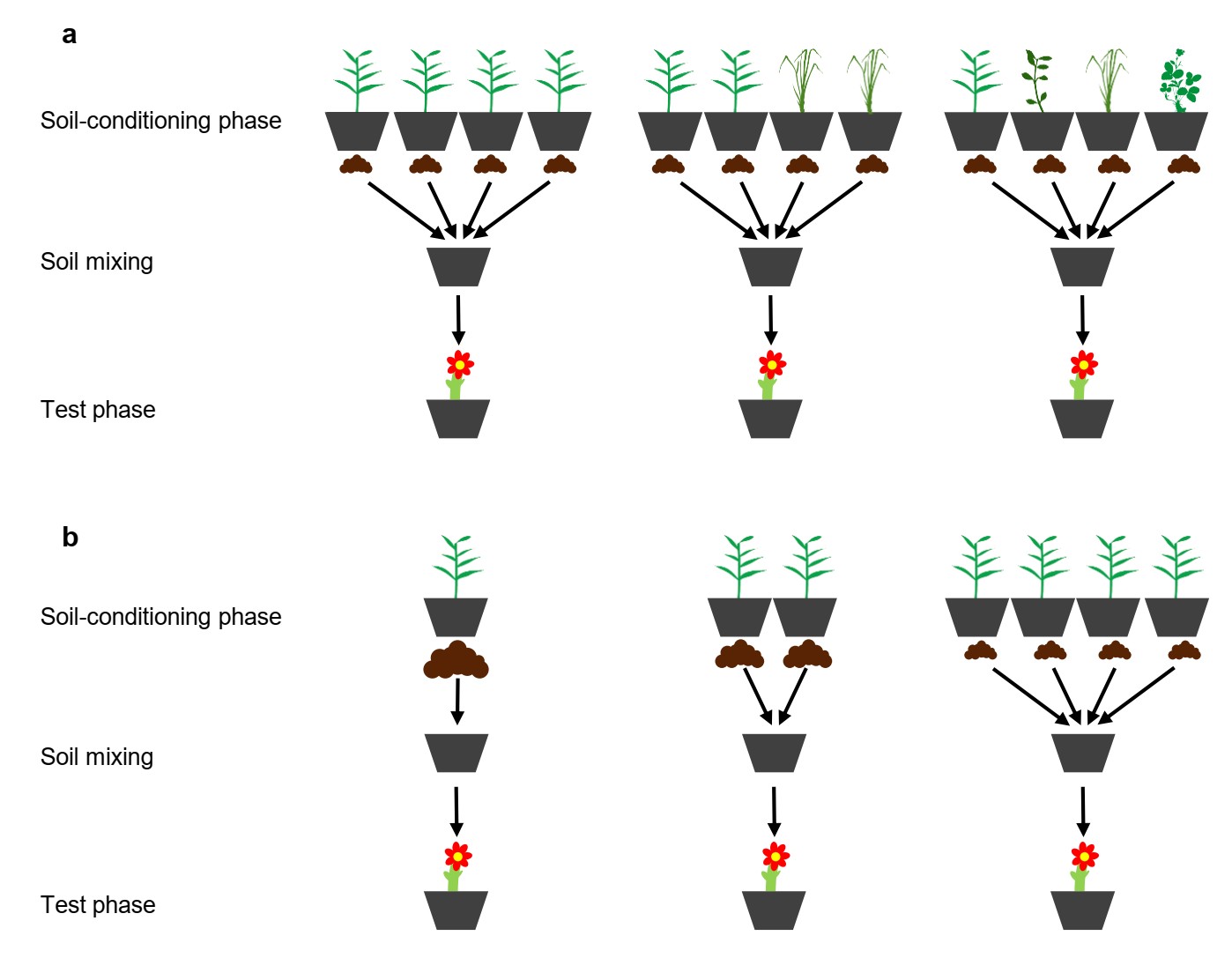針對以上研究缺口,中科院東北地理與農(nóng)業(yè)生態(tài)研究所生物入侵生態(tài)學(xué)研究團隊與德國康斯坦茨大學(xué)生態(tài)學(xué)研究團隊借鑒植物-土壤反饋的研究方法,利用溫室控制實驗,探究了本地植物多樣性如何通過土壤微生物調(diào)控外來植物的入侵過程。實驗第一階段,研究人員利用不同的本地植物物種馴化土壤微生物群落,并測定了不同植物馴化后的土壤微生物群落多樣性。實驗第二階段,研究人員將來自不同植物馴化過的土壤人工混合,組成不同的植物多樣性梯度的馴化土壤(分別是多樣性1、2和4),然后在這些土壤里種植外來植物,并測定其生長表現(xiàn)。