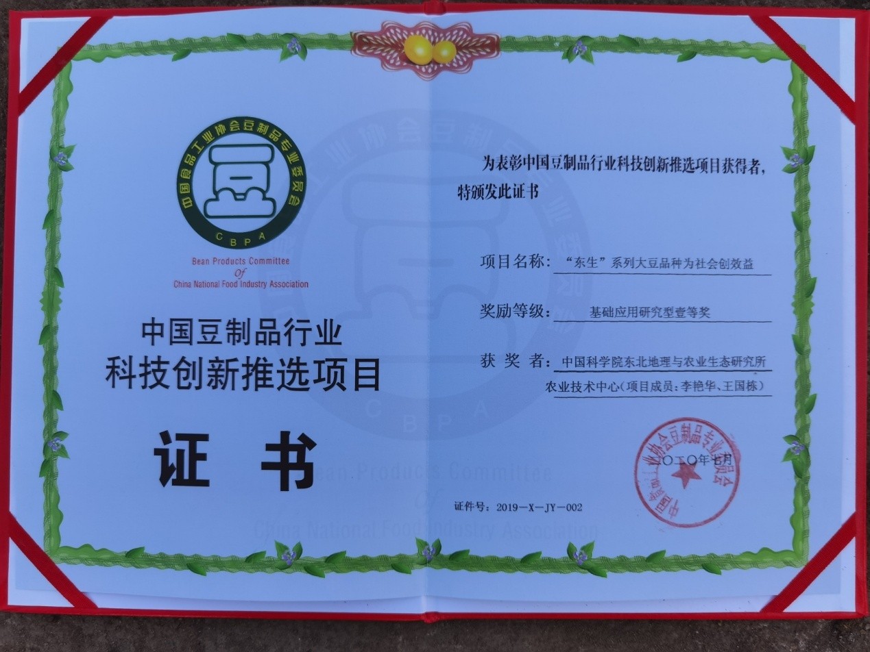 “‘東生’系列大豆為社會創效益”獲得“中國豆制品行業科技創新推選項目”一等獎勵