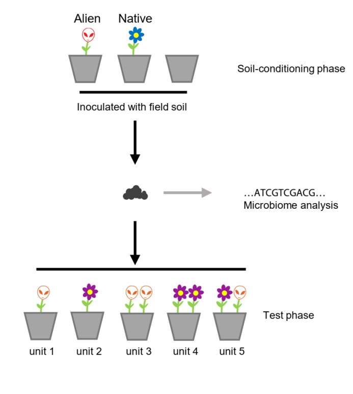 研究人員利用植物-土壤反饋的研究手段(圖1),在第一階段,選擇了4種外來植物和6種本地植物分別對土壤進(jìn)行了馴化(即隨著植物的生長,它會改變土壤微生物的構(gòu)成),并設(shè)置了一個(gè)沒有植物的對照。植物生長15周后,研究人員收獲了土壤,并采樣進(jìn)行擴(kuò)增子測序得到土壤細(xì)菌和真菌的群落結(jié)構(gòu)。在第二階段,研究人員將新一批植物(5種外來植物和5種本地植物)種在了收獲的土壤,共設(shè)置了5個(gè)競爭處理:外來/本地種的單種,外來/本地種的單物種種群,以及外來本地種的混種群落。