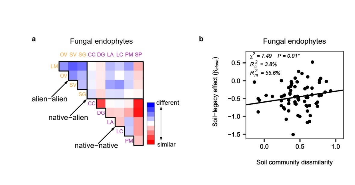 圖3 不同植物土壤微生物群落的相似度(a)。藍(lán)色代表相似度低,紅色代表相似度高。左上角為外來植物之間的相似度,右下角為本地植物之間的相似度,中間為外來植物與本地植物之間的相似度。土壤微生物群落相似度與土壤遺留效應(yīng)的關(guān)系(b)。正的土壤遺留效應(yīng)代表植物對土壤馴化促進(jìn)后來植物的生長。本圖僅展示內(nèi)生真菌,細(xì)菌,整體真菌的結(jié)果具有相同趨勢,但不顯著,具體可見原文。