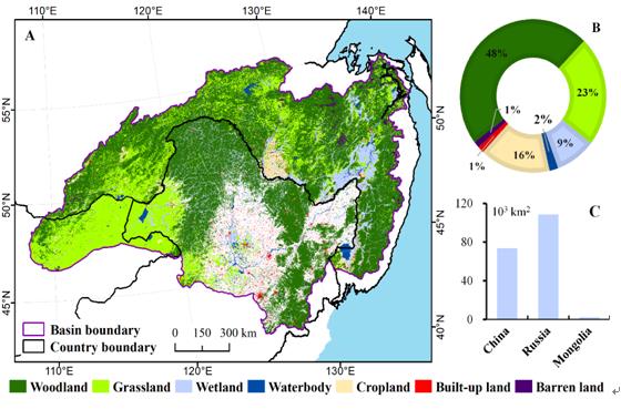 圖 黑龍江流域土地覆被空間格局及不同國家濕地分布情況