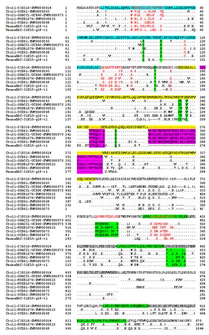 圖3:Chr11抗性基因蛋白(CC)-NBS-LRR 與Chr21和感病品種中的同源抗性蛋白比較 (首行藍色代表CC結構域,黃色代表NB-ARC結構域,綠色和灰色代表LRR結構域)