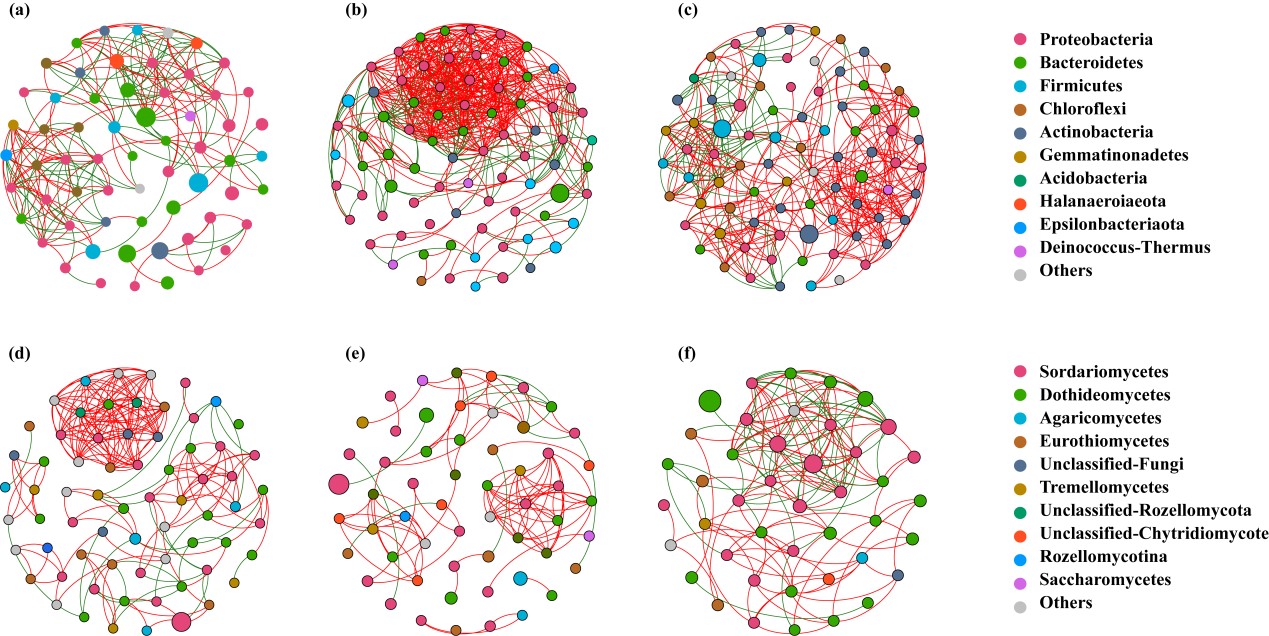 生態學研究普遍側重于環境的時空變化對生物的影響。對于生物改變環境,尤其是生物擾動這種不存在直接營養關系的生態學研究關注往往較少。河口濕地底棲無脊椎動物分布廣泛,數量巨大,其活動對濕地沉積物具有高頻率和高強度的擾動。蟹類是濱海潮間帶濕地中最重要的底棲動物之一,其掘洞行為顯著影響沉積物的養分有效性和沉積物的水分交換。目前蟹類掘洞等行為對沉積物微生物群落結構的影響仍知之甚少,限制了人們對濕地生物擾動和元素循環的認知。為此,東北地理所濕地生物與環境學科組科研人員,在黃河三角洲河口濕地開展了相關研究,對比分析了蟹洞洞口土丘(SM)、洞內(WS)和未擾動沉積物(CT)三類沉積物的微生物群落組成和生物網絡特征。