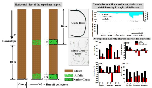 東北黑土區(qū)是中國重要的糧食核心產區(qū)和最大的商品糧生產基地,由于坡地被大量墾殖,水土流失逐年加劇,造成了嚴重的農業(yè)面源污染。目前采用的最佳管理措施(BMPs),如壟作區(qū)田、地埂、魚鱗坑等,多以水土保持為目標進行設計,對于污染的削減主要通過大量攔截泥沙、徑流來實現(xiàn)。這些措施可能造成上游來水銳減,影響下游河流和湖庫的水生態(tài)質量,尤其是在水源地流域,入庫徑流的減少可能造成水質進一步惡化、供水保證率降低,給下游居民的生產、生活用水帶來困難。為此,東北地理所水環(huán)境污染與防治學科組科研人員研發(fā)了新型等高植物草籬技術,并利用在吉林省遼源市東遼縣杏木國家級水土保持示范園區(qū)內的標準小區(qū),開展了草籬污染物削減能力實地監(jiān)測與模型模擬驗證工作。