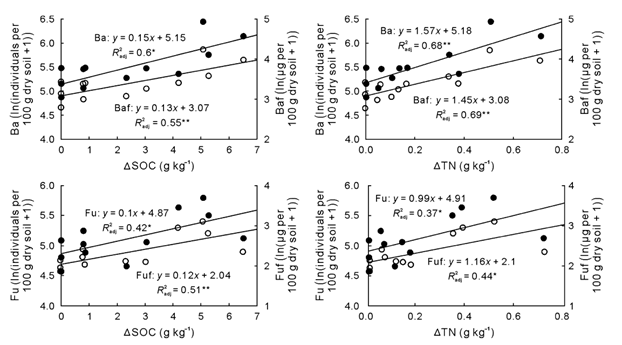 研究結果表明:在農田生態系統中,施用高量有機肥(22.5t/ha豬糞)增加了優勢線蟲的數量,食細菌線蟲和食真菌線蟲的豐度隨有機肥施用量的增加呈遞增的趨勢。有機肥的施用量也影響土壤線蟲食物網結構,線蟲通路指數在5月和10月份隨有機肥施用量的增加呈降低趨勢,而三個取樣時期富集指數隨有機肥施用量的增加均呈遞增的趨勢(圖1),線性回歸分析表明食細菌線蟲和食真菌線蟲的豐度及代謝足跡與土壤TOC和TN的增量呈顯著正相關(圖2)。這些結果表明隨有機肥施用量的增加,有機物細菌降解路徑的比率增大,有機肥施用量主要影響處在食物網低營養級線蟲的活性和功能,從土壤線蟲群落結構和功能的角度分析,適量增加有機肥的施用量可促進土壤食物網物中物質循環和能量流動。
