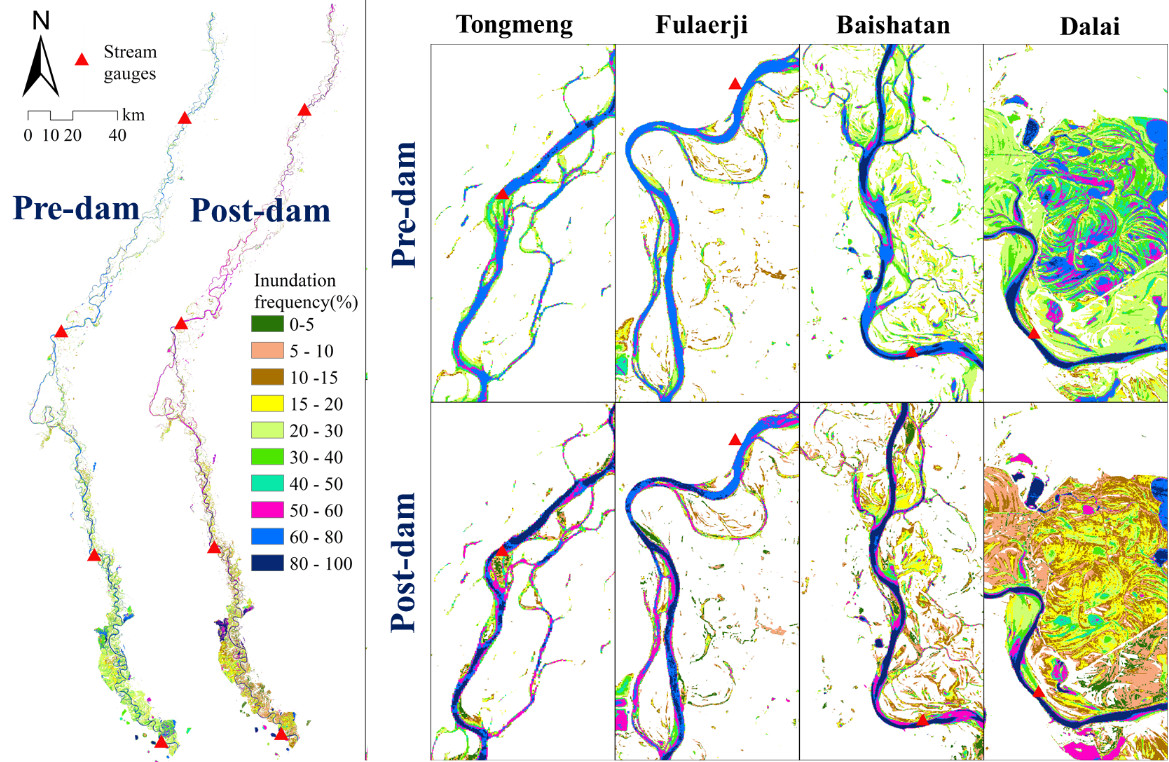 河濱濕地在維系流域水安全和生態(tài)安全等方面發(fā)揮著極為重要作用。水庫(kù)大壩在為全球社會(huì)經(jīng)濟(jì)發(fā)展起到重要支撐作用的同時(shí),也對(duì)河濱濕地生態(tài)系統(tǒng)施加了巨大的干擾,是引起河濱濕地面積萎縮、功能退化甚至喪失等的主要因素之一。洪水脈沖在維系河濱濕地生態(tài)系統(tǒng)健康中發(fā)揮著極為重要的作用。如何從洪水脈沖視角定量揭示水庫(kù)大壩對(duì)下游河濱濕地的影響成為濕地退化水文學(xué)機(jī)制研究的關(guān)鍵科學(xué)問題。為此,東北地理所水文與水資源學(xué)科組科研人員選擇嫩江尼爾基水庫(kù)下游為研究區(qū),基于多情境下河濱濕地—河道水文交互過程模擬和遙感淹沒分析,定量闡明了水庫(kù)大壩建設(shè)對(duì)下游河濱濕地淹沒頻率和洪水脈沖強(qiáng)度的影響,并提出了維持河濱濕地生態(tài)健康的洪水脈沖機(jī)制可為流域濕地水文調(diào)控和水資源調(diào)度提供重要理論支撐。