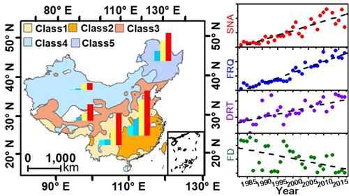 目前,我國(guó)藍(lán)藻水華遙感研究多集中在三湖一庫(kù)(太湖、巢湖、滇池、三峽水庫(kù)),為了闡明20世紀(jì)80年代以來(lái)中國(guó)湖泊及水庫(kù)中藻華暴發(fā)的時(shí)空特征,中國(guó)科學(xué)院東北地理與農(nóng)業(yè)生態(tài)研究所水環(huán)境遙感學(xué)科組科研人員借助遙感技術(shù)手段,基于289,600景Landsat影像,明確了1983-2017年中國(guó)面積大于1 km2的湖泊和水庫(kù)中藻華空間分布格局。研究結(jié)果表明,1983-2017年,全國(guó)共有48個(gè)湖泊暴發(fā)過(guò)藻華(1258次)。全國(guó)湖庫(kù)藻華暴發(fā)持續(xù)時(shí)間、爆發(fā)頻次都隨時(shí)間變化呈現(xiàn)明顯的擴(kuò)張趨勢(shì),48個(gè)湖庫(kù)藻華年暴發(fā)頻次從20世紀(jì)80年代的9.14上升到了72.43,且藻華暴發(fā)湖泊分布有東西擴(kuò)張的趨勢(shì)。根據(jù)緯度分布和柯本氣候分類(lèi)系統(tǒng),本文將整個(gè)中國(guó)劃分為5個(gè)分區(qū),斯皮爾曼相關(guān)系數(shù)和隨機(jī)森林分析結(jié)果表明,風(fēng)速和氣溫是影響中國(guó)藻華擴(kuò)張的主要?dú)夂蛞蛩?,且這種影響在第4分區(qū)(熱帶疏林和溫帶草原氣候區(qū))湖泊中表現(xiàn)更為顯著。此外,本文定量對(duì)比了人類(lèi)活動(dòng)和氣候要素對(duì)藻華時(shí)空演變的影響,結(jié)果表明,對(duì)于大部分地區(qū)的藍(lán)藻水華人類(lèi)活動(dòng)的影響起主導(dǎo)作用。但實(shí)際的影響過(guò)程大多是通過(guò)氣候因素和人類(lèi)活動(dòng)的協(xié)同產(chǎn)生的。本研究為藻華暴發(fā)機(jī)理研究以及預(yù)防控制提供了良好的數(shù)據(jù)和理論基礎(chǔ),對(duì)國(guó)內(nèi)外湖泊藻華暴發(fā)治理及富營(yíng)養(yǎng)化治理具有重要的指導(dǎo)意義。