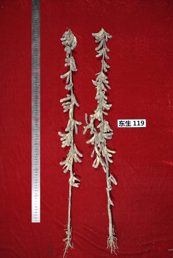 “東生119” (審定編號:吉審豆20210029)為高產大豆新品種。該品種以吉育47為父本,黑農51為母本。2019-2020年區域試驗平均公頃產量3009.3公斤,比對照吉育86增產8.1%;2020年生產試驗平均公頃產量2953.1公斤,比對照吉育86增產5.4%。亞有限結莢習性,平均株高88.1厘米,主莖型結莢,主莖節數17.7個,以三粒莢為主,莢熟時呈深褐色。圓葉、白花、灰毛,籽粒圓形,種皮黃色,有光澤,種臍黃色,平均百粒重21.6克。人工接種鑒定,高抗大豆花葉病毒1號株系,高抗大豆花葉病毒3號株系。兩年平均籽粒粗蛋白質含量38.14%,粗脂肪含量21.24%。