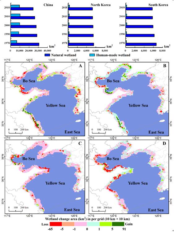東亞-澳大利西亞水鳥遷徙廊道是全球最大的水鳥遷徙路徑之一,其中環黃渤海濕地是最為重要的棲息生境,對于遷徙水鳥的保護具有重要的作用。環黃渤海地區,地跨朝鮮半島西海岸和中國江蘇啟東市以北長度超過1萬公里的海岸線,是東北亞地區經濟快速發展的重點區域之一,因此區域濕地和遷徙水鳥受人為脅迫干擾嚴重。準確理解濕地分布范圍、變化趨勢和主要驅動因素對于保護濕地生態系統和生物多樣性等具有重要的科學意義和社會價值,是學術界重點關注的熱點話題。然而,環黃渤海地區長時間序列濕地生境及其人為脅迫的跨境對比分析方面仍存在明顯的不足。