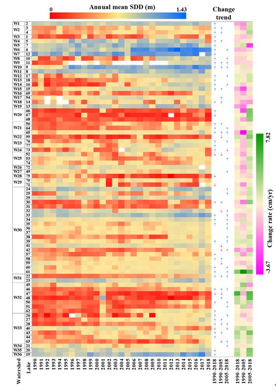 透明度,作為一種最直觀地反映水體光學特性的指標之一,常被用來監(jiān)測水體的質量狀況。該指標能夠揭示水體的透明程度和渾濁度,也能夠綜合地反映水體生態(tài)系統(tǒng)的營養(yǎng)狀態(tài)。遙感技術手段的出現(xiàn),使得大范圍監(jiān)測湖庫透明度變化成為可能。遙感反演透明度的算法主要包括三種:分析算法,半分析算法和經驗算法。其中經驗算法被廣泛地用來反演不同區(qū)域尺度透明度變化。以往研究學者對松花江流域透明度的遙感監(jiān)測時段主要集中在2000年以后,且側重透明度反演算法的研究。因此,中國科學院東北地理與農業(yè)生態(tài)研究所水環(huán)境遙感學科組的科研人員們基于2004-2017年實測湖庫透明度數(shù)據(jù)和GEE云計算平臺,運用經驗算法開展了遙感反演松花江流域77個湖泊透明度的長時間序列(1990-2018年)動態(tài)變化研究。結果發(fā)現(xiàn),2005年以來松花江流域的湖庫水質得到改善。具體來說,2005-2018年松花江流域的年均透明度表現(xiàn)為上升的趨勢(p<0.05),從0.29米增加到0.37米。而且,從1990-2005到2005-2018,透明度表現(xiàn)為上升趨勢的湖泊個數(shù)由18個增加到31個(圖1)。通過影響因素貢獻率分析,發(fā)現(xiàn)用于農業(yè)生產的化肥對湖庫透明度年際變化的貢獻率最大,其次是廢水排放和植被覆蓋(NDVI)。進一步分析,得出松花江流域水質改善的原因主要包括兩方面,一是廢水排放的處理能力和數(shù)量有了很大提高,二是植被覆蓋有了很大改善。但是,農業(yè)的非點源污染對松花江流域的湖庫水質影響仍然存在,在將來仍然需要對湖庫的水質改善繼續(xù)做出努力。