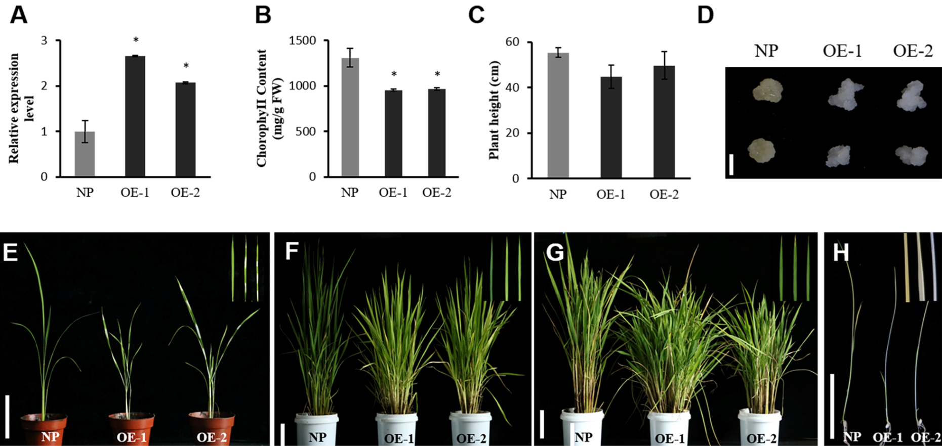 (A) 野生型植株與超量表達植株中OsOR基因的表達量分析。(B) 葉片中葉綠素含量檢測。(C) 野生型植株與超量表達植株的株高分析。(D) 野生型與超量表達OsOR基因的愈傷組織表型分析。(E) 分蘗早期表型分析。 (F)分蘗晚期表型分析。(G) 成熟期表型分析。(H) 暗處理下表型分析。