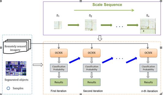 東北地理所地理信息系統(tǒng)學(xué)科組研究人員,針對(duì)高分影像農(nóng)作物種植結(jié)構(gòu)信息提取難題,提出了一種新穎的尺度序列面向?qū)ο笊疃染矸e網(wǎng)絡(luò)方法(Scale Sequence Object-based Convolutional Neural Network (SS-OCNN))。SS-OCNN有以下兩方面獨(dú)特優(yōu)勢(shì):1)SS-OCNN是一種面向?qū)ο蠓治龇椒ǎ唇⒃谟跋衩嫦驅(qū)ο蠓指罨A(chǔ)之上),因此避免了傳統(tǒng)基于像元分類(lèi)器的“椒鹽噪音”問(wèn)題;2)SS-OCNN在使用深度學(xué)習(xí)特征提取過(guò)程中,從小到大使用多個(gè)尺度窗口卷積影像并融合多尺度信息,可有效應(yīng)對(duì)農(nóng)田斑塊面積變異性的難題,提高了農(nóng)作物特征提取的觀測(cè)維度。