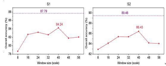 圖2. CNN卷積窗口尺寸對(duì)于OCNN(紅色線(xiàn)段)和SS-OCNN(紫色虛線(xiàn)段)的影響