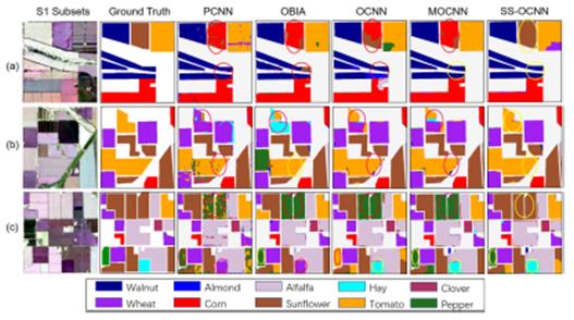 研究人員使用UAVSAR(S1)和Rapideye(S2)兩種高分遙感影像對(duì)提出的SS-OCNN有效性進(jìn)行了驗(yàn)證。研究結(jié)果表明,使用多個(gè)卷積窗口SS-OCNN方法比使用單一卷積窗口OCNN方法農(nóng)作物分類(lèi)精度提高3%-10%,極大地改善了農(nóng)作物種植結(jié)構(gòu)信息遙感提取精度。此外,一些傳統(tǒng)方法難以區(qū)分的小生物量作物(例如飼草類(lèi)),其分類(lèi)精度也得到了顯著的提高,進(jìn)一步證實(shí)了多尺度觀測(cè)信息對(duì)于深度學(xué)習(xí)農(nóng)作物種植結(jié)構(gòu)信息提取的必要性。