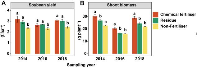 玉米-大豆輪作是東北黑土區(qū)主要的種植模式。然而,由于植物-土壤-微生物之間的相互作用,玉米秸稈還田如何改變大豆氮吸收模式仍不清楚;量化下一季大豆對(duì)玉米秸稈氮的利用,對(duì)于優(yōu)化氮肥的施用策略,促進(jìn)黑土區(qū)農(nóng)業(yè)的可持續(xù)發(fā)展至關(guān)重要。為此,中國(guó)科學(xué)院東北地理所的研究人員于2013年在黑龍江省海倫市設(shè)立田間定位試驗(yàn),基于玉米-大豆輪作體系,在玉米生長(zhǎng)季正常施用化肥,研究了大豆生長(zhǎng)季(1)不施肥(2)施用化肥和(3)玉米秸稈還田對(duì)大豆氮吸收及產(chǎn)量形成的影響。結(jié)果表明:在玉米-大豆輪作條件下,秸稈還田處理與施用化肥處理之間的大豆產(chǎn)量沒有顯著差異(P > 0.05)(圖1),秸稈還田處理大豆的收獲指數(shù)明顯提高,這很可能是因?yàn)橛衩捉斩掃€田改變了下茬大豆對(duì)氮的積累模式。為此,利用穩(wěn)定同位素15N標(biāo)記的方法,深入研究了大豆對(duì)肥料氮、土壤氮、秸稈氮和共生固氮的利用,探討了秸稈還田對(duì)大豆植株體內(nèi)不同來(lái)源氮素的積累影響以及與大豆產(chǎn)量形成之間的關(guān)系。研究結(jié)果揭示了秸稈還田可增加大豆生長(zhǎng)后期的氮吸收量,但R5-R8期營(yíng)養(yǎng)器官氮素的再利用量卻顯著下降(圖2),發(fā)現(xiàn)秸稈還田對(duì)大豆氮素積累影響主要來(lái)自對(duì)共生固氮的促進(jìn)作用,表現(xiàn)為根瘤數(shù)量、質(zhì)量和密度顯著提高。進(jìn)一步的機(jī)制研究發(fā)現(xiàn),秸稈還田顯著提高了大豆根際固氮nifH基因拷貝數(shù)且改變固氮微生物群落結(jié)構(gòu)(圖3),固氮菌對(duì)結(jié)瘤位的競(jìng)爭(zhēng)能力增強(qiáng)。基于此研究結(jié)果,我們認(rèn)為黑土玉米-大豆輪作體系可以通過秸稈還田的方式來(lái)達(dá)到減少氮肥施用,提高大豆固氮生態(tài)效應(yīng),進(jìn)而實(shí)現(xiàn)大豆穩(wěn)產(chǎn)、高產(chǎn)。