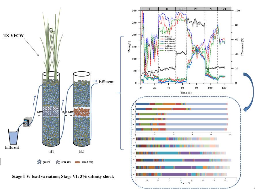 低碳氮比廢水的不適當處理在世界范圍內引起廣泛關注。人工濕地作為可持續的生態凈化技術已被成功應用于不同類型污水的處理。科研人員前期對人工濕地基質強化脫氮方面做出了重要貢獻,但在鐵礦石/錳礦石與木頭芯片組合模式強化硝化和反硝化脫氮方面仍缺乏系統性的研究。鹽分沖擊也是人工濕地處理系統脫氮的最大挑戰,可能會瞬間提高細胞滲透壓和抑制微生物活性。針對這一技術難題,東北地理所水環境污染與防治學科組科研人員,設計并構建了鐵礦石/錳礦石與木頭芯片基串聯-垂直流人工濕地(TS-VFCWs)(CN201911301822.2、CN201911301820.3),系統揭示了污染負荷和鹽分脅迫下TS-VFCWs脫氮性能和功能菌群特征(Chietal.2021)。