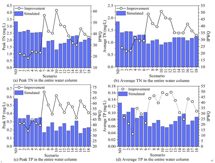 圖2 TN和TP的峰值濃度(a, c)和平均(b, d)濃度,以及不同情景下IPWQ的變化。“ND”表示沒有引調(diào)水