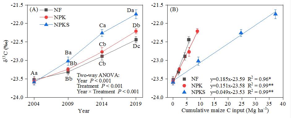 圖2 土壤有機碳的δ13C值以及δ13C值與累計玉米碳投入的相關(guān)性