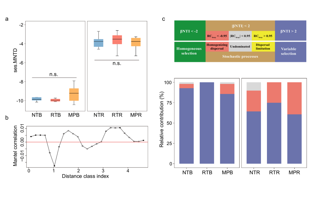 東北地理與農業生態研究所農田分子生態學科組和黑土有機碳與保護性耕作學科組,對免耕(NT)、少耕(RT)和傳統耕作(MP)處理下土壤微生物群落組成、裝配過程和分子網絡結構進行解析,探討了保護性耕作下黑土農田土壤微生物群落結構演替及發生機制對土壤質量和作物生產力的影響。研究結果表明,不同耕作方式顯著改變了根際和非根際土壤微生物群落,與傳統耕作MP相比,保護性耕作NT和RT顯著增加了硝化菌Nitrosospira sp.和固氮菌Mesorhizobium sp., Bradyrhizobium sp.和Burkholderia sp.相對豐度,但降低了具有有機質物分解功能的Blastococcus sp., Streptomyces sp.和Sphingomonas sp.相對豐度。網絡分析和隨機森林分析發現,上述功能菌在NT和RT處理中被注釋為關鍵物種(keystone taxa),這表明保護性耕作更有助于土壤碳固定,并促進土壤的生物固氮和硝化作用(圖1)。