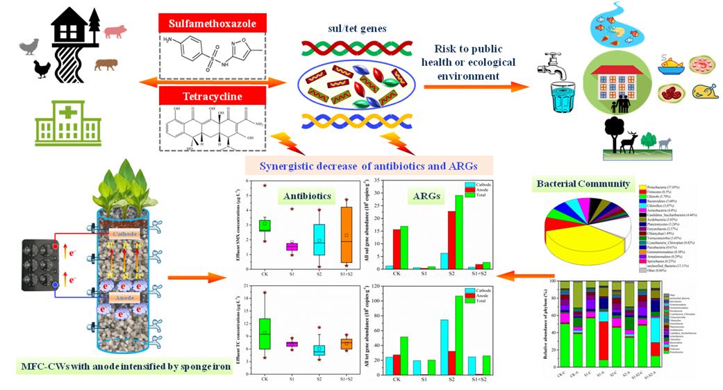 中科院東北地理與農業生態研究所水環境污染與防治學科團隊選擇磺胺甲惡唑(SMX)和四環素(TC)兩種典型抗生素,探究了MFC-CWs對抗生素的去除過程、關鍵影響因素與機理;在前期獲得的科學認知的基礎上,進一步對MFC-CWs的主要功能區進行了優化,研發了基于海綿鐵-陽極區強化的抗生素與ARGs高效協同去除技術。