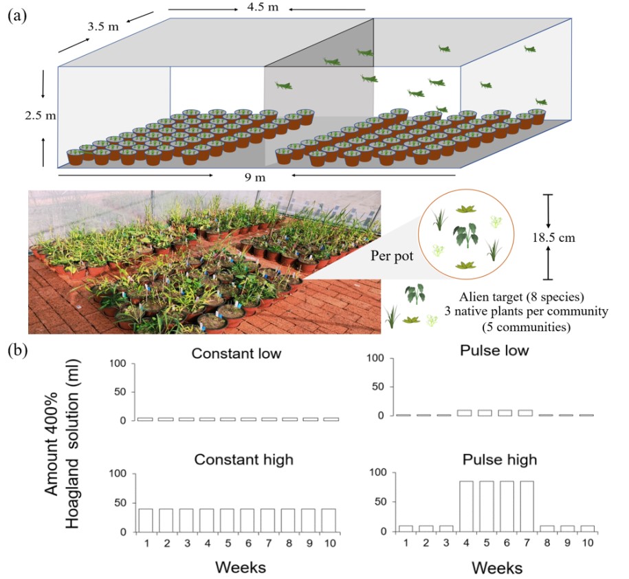 圖一:實(shí)驗(yàn)設(shè)計(jì)圖解。實(shí)驗(yàn)處理示意圖、實(shí)驗(yàn)期間的蟲(chóng)食處理室照片、外來(lái)植物和本地植物在花盆內(nèi)的位置(a);不同養(yǎng)分處理對(duì)應(yīng)的營(yíng)養(yǎng)液供給量(b)。在低養(yǎng)分水平和高養(yǎng)分水平處理下,恒定的養(yǎng)分添加與脈沖式養(yǎng)分添加在整個(gè)生長(zhǎng)季獲得的養(yǎng)分總量相同。