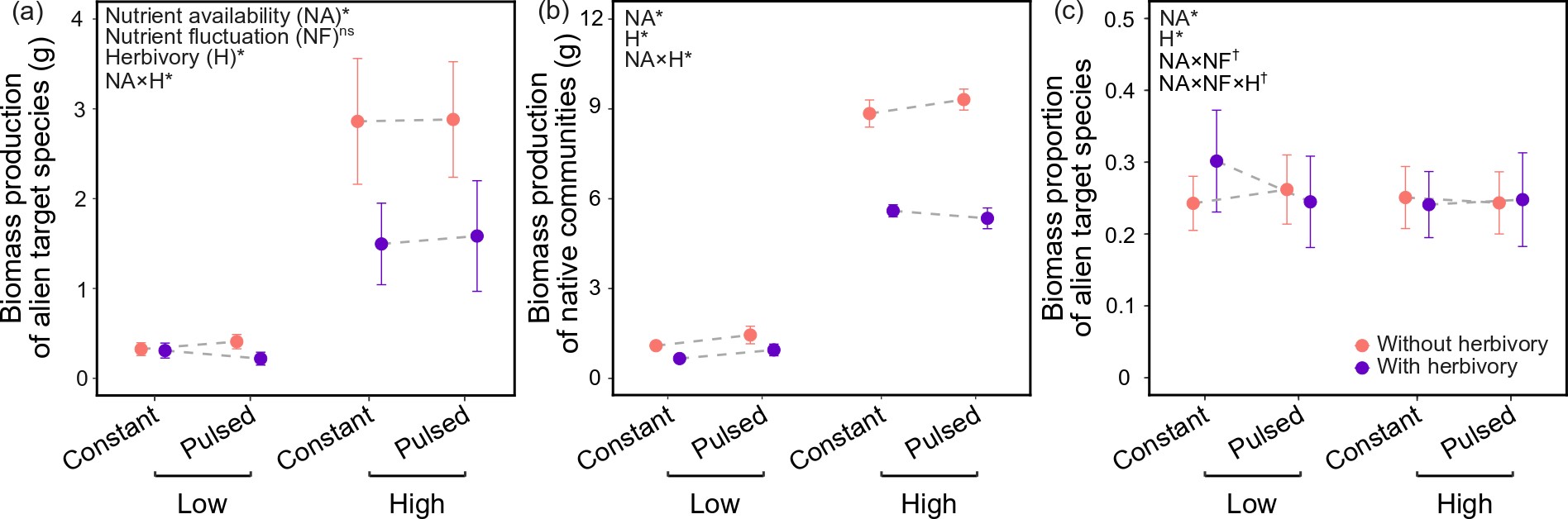 圖二:在兩種養(yǎng)分有效性(低與高)、兩種養(yǎng)分波動(dòng)(持續(xù)與脈沖)和兩種昆蟲(chóng)采食處理(有與無(wú))組合下,外來(lái)目標(biāo)物種(a)和本地群落(b)的生物量以及外來(lái)目標(biāo)物種在群落中的生物量占比(c)。