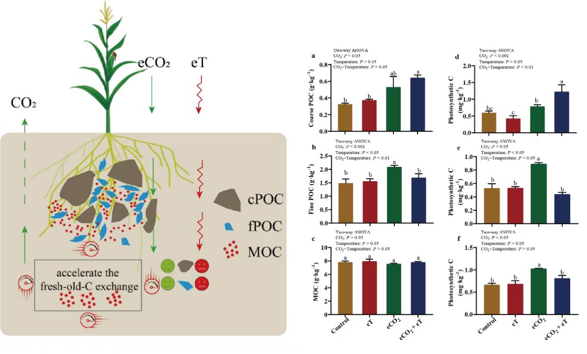 東北地理與農(nóng)業(yè)生態(tài)研究所農(nóng)田分子生態(tài)學(xué)科組研究人員,利用開頂式氣候室(OTC)模擬大氣CO2濃度和溫度升高,通過穩(wěn)定同位素13C示蹤技術(shù),量化出了玉米全生育期內(nèi)光合碳在黑土有機(jī)碳庫(kù)各組分的分配去向。研究發(fā)現(xiàn),在高CO2濃度條件下,玉米的生物量并未增加,但顯著提高了玉米光合碳在土壤細(xì)顆粒有機(jī)碳(fine POC)和礦質(zhì)有機(jī)碳(MOC)組分中的積累;但在大氣CO2濃度和溫度雙升高條件下,這種光合碳分配現(xiàn)象則消失,研究結(jié)果表明升溫會(huì)促進(jìn)新鮮有機(jī)碳-光合碳的分解,土壤的光合碳分配量未表現(xiàn)出增加趨勢(shì)。連續(xù)4個(gè)生長(zhǎng)季的大氣CO2濃度和溫度雙升高并未增加總有機(jī)碳的積累,但會(huì)加速土壤有機(jī)碳的周轉(zhuǎn)速率(圖1),該研究為氣候變化影響黑土農(nóng)田土壤碳循環(huán)提供理論支撐。