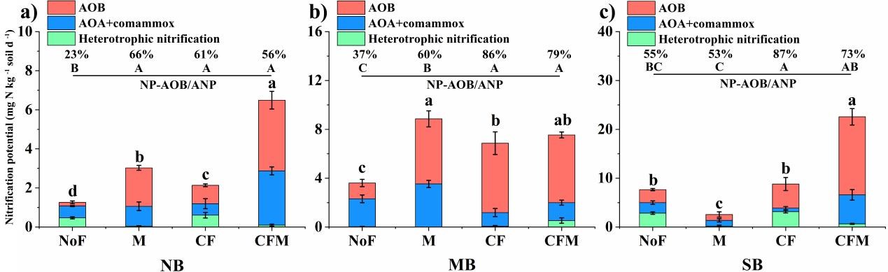 土壤氨氧化也稱為硝化,分為自養(yǎng)和異養(yǎng)兩個過程。自養(yǎng)微生物的氨氧化細菌(AOB)、氨氧化古菌(AOA)和全程氨氧化細菌(Comammox)共同驅動土壤銨態(tài)氮向硝態(tài)氮轉化,但三類氨氧化微生物的相對貢獻因土壤環(huán)境變化存在較大差異。東北黑土農田土壤氮素含量相對較高,但氮肥的利用效率不高,為控制銨態(tài)氮向硝態(tài)氮轉化及提高肥料利用率,解析氨氧化微生物介導的黑土農田硝化作用具有重要的實踐意義。為此,東北地理所的科研人員聯合黑龍江省農科院土肥所、黑河分院及吉林省農科院研究團隊,利用位于黑河(NB)、民主鄉(xiāng)(MB)和公主嶺(SB)的三個30余年的黑土野外定位施肥平臺,研究了長期化肥與有機肥不同施用方式下的土壤氨氧化微生物豐度、活性和相對硝化貢獻的變化情況。