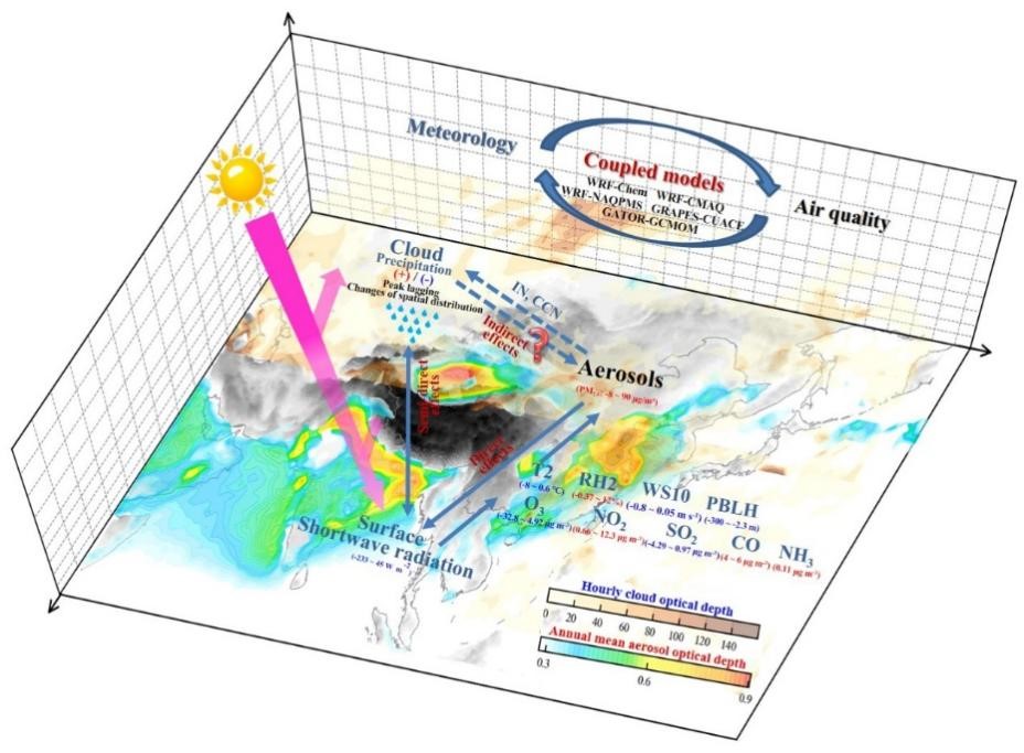 Gao, C., Xiu, A., Zhang, X., Tong, Q., Zhao, H., Zhang, S., Yang, G., and Zhang, M.: Two-way coupled meteorology and air quality models in Asia: a systematic review and meta-analysis of impacts of aerosol feedbacks on meteorology and air quality, Atmospheric Chemistry and Physics, 2022, 22(8), 5265–5329,https://doi.org/10.5194/acp-22-5265-2022.