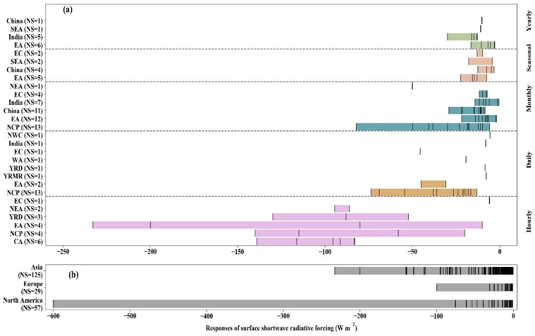 圖2 氣溶膠反饋效應(yīng)導(dǎo)致亞洲不同地區(qū)和時間尺度地面短波輻射強迫的變化情況及其與歐美地區(qū)的對比分析