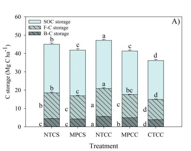 玉米連作系統下,超過50%的SOC儲量增量發生于微生物殘體碳中(0-20 cm),這主要由于秸稈還田,而且該增量比玉米-大豆輪作系統高(圖2)。真菌殘體碳儲量在SOC中的比例不受農田管理措施(秸稈還田、耕作方式、種植制度)的影響,而細菌殘體碳的占比同時受到秸稈還田的數量和質量的影響。相比于玉米輪作系統,玉米連作更有利于微生物死體碳的固存,細菌對農田管理措施的敏感性相對高于真菌。因此,本文證明了秸稈覆蓋有利于微生物殘體碳的累積,對有機碳的長期穩定與固存有重要意義,其中玉米連作的固碳能力更強,該結果對未來農田黑土秸稈管理措施的制定提供指導作用。