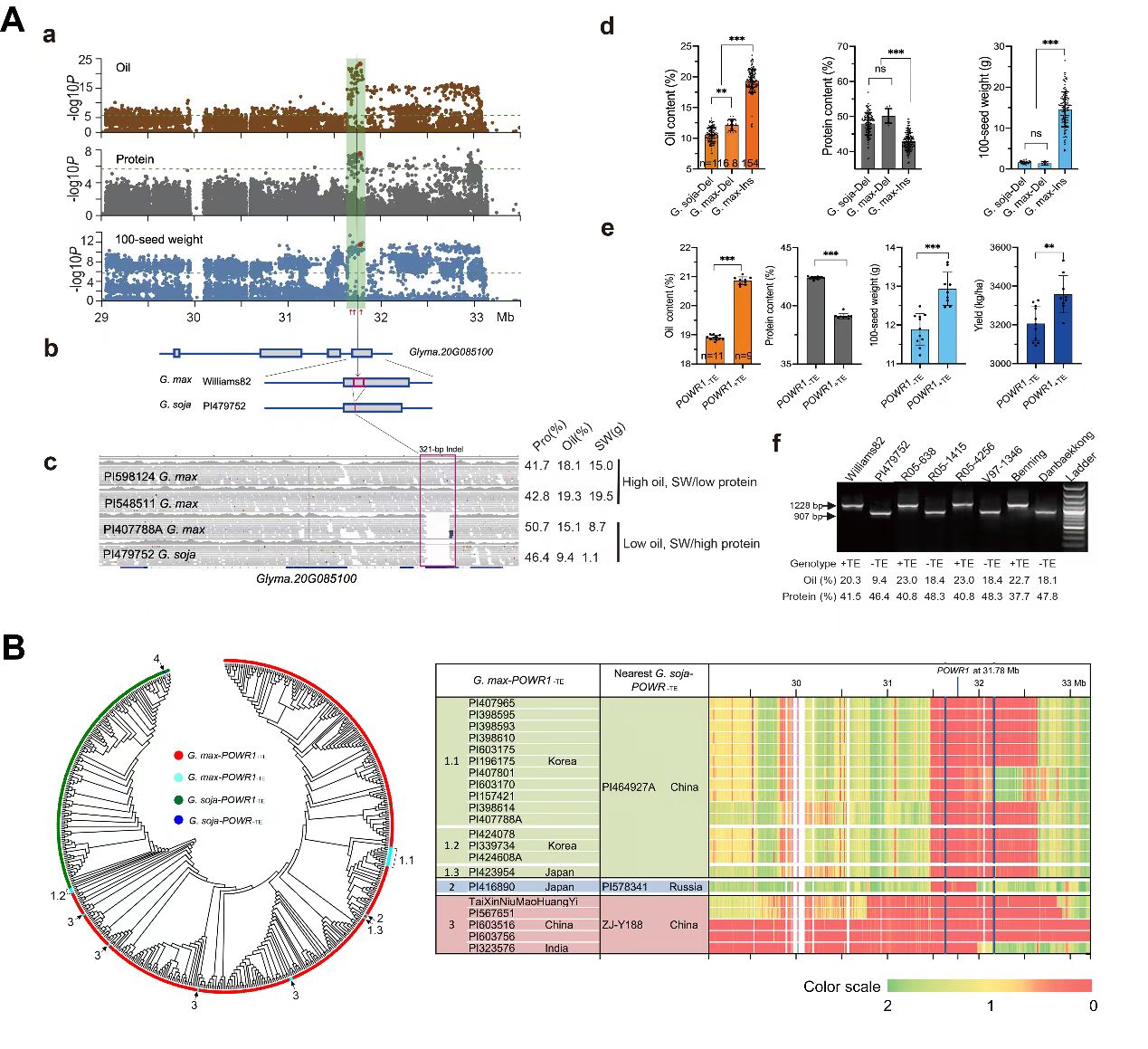 本研究利用經(jīng)典連鎖QTL分析結(jié)合基因組測序數(shù)據(jù)聯(lián)合分析,鑒定到位于20號染色體的一個主效QTL cqPro-20。該QTL自1992年首次鑒定,在不同遺傳背景中被鑒定到,但基因不清楚,發(fā)掘其控制基因一直是大豆蛋白研究的主要內(nèi)容。研究發(fā)現(xiàn)一個編碼CCT結(jié)構(gòu)域的基因POWR1(Protein, Oil, Weight Regulator 1)控制cqPro-20,一個321-bp轉(zhuǎn)座子在CCT結(jié)構(gòu)域的插入/缺失是該位點引起蛋白和油脂變異的主因(圖1A)。通過群體基因組學、近等基因系和大豆遺傳轉(zhuǎn)化研究證實POWR1調(diào)控蛋白質(zhì)和油份含量,同時影響粒重和田間產(chǎn)量;突變和野生型分別控制高油和高蛋白表型,從遺傳上解釋了部分蛋-油負相關遺傳基礎。研究也表明POWR1是大豆馴化的重要基因之一,高油基因型受到強烈選擇,推斷對高油基因型的強烈選擇主要是由于對大籽粒的優(yōu)先選擇而導致。高蛋白基因型在栽培大豆中含量很少且主要分布在亞洲,并且在POWR1位點有明顯的基因?qū)牒圹E(圖1B),推測與本地高蛋白育種需求有關,符合亞洲自古都是大豆蛋白主要消費地的認識。這項研究為闡明大豆蛋白質(zhì)和油份的分子調(diào)控機制以及高蛋白的精準分子育種帶來了機遇。