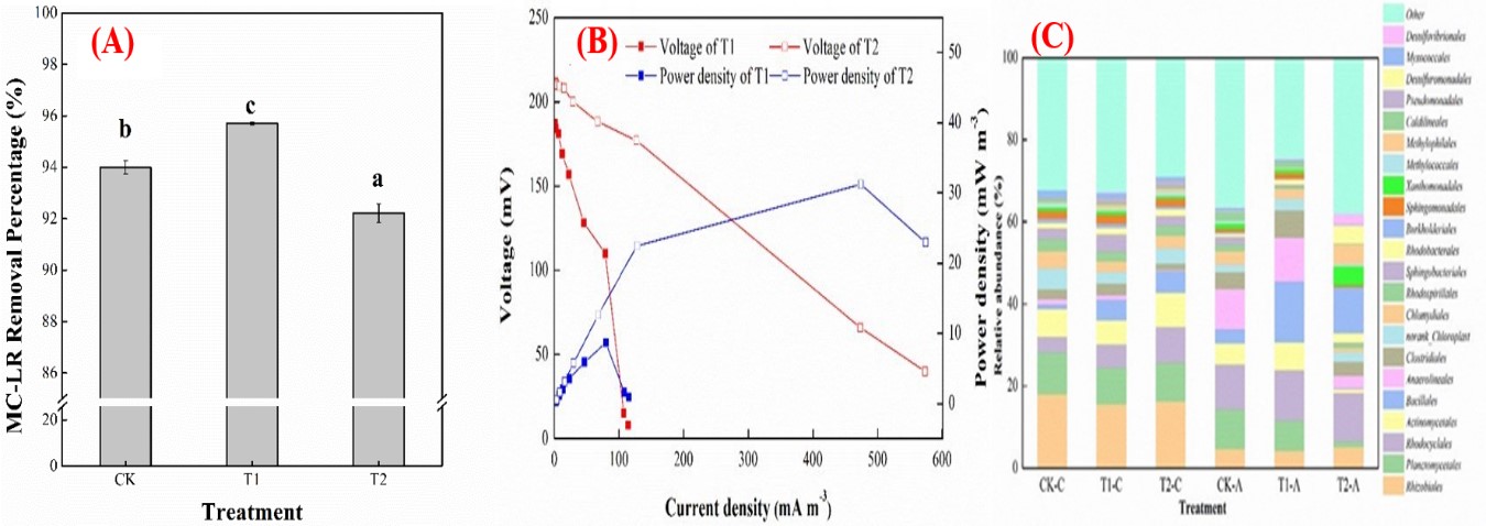 圖1 MFC-CWs對MC-LR的去除效果(A)、系統產電性能(B)與微生物群落結構(C)