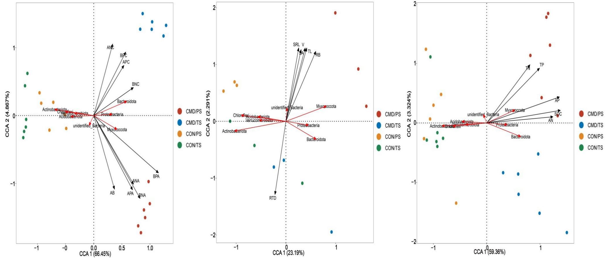 圖2冗余分析顯示細菌門水平群落組成與燕麥生物量,養分吸收和歸還的相關關系