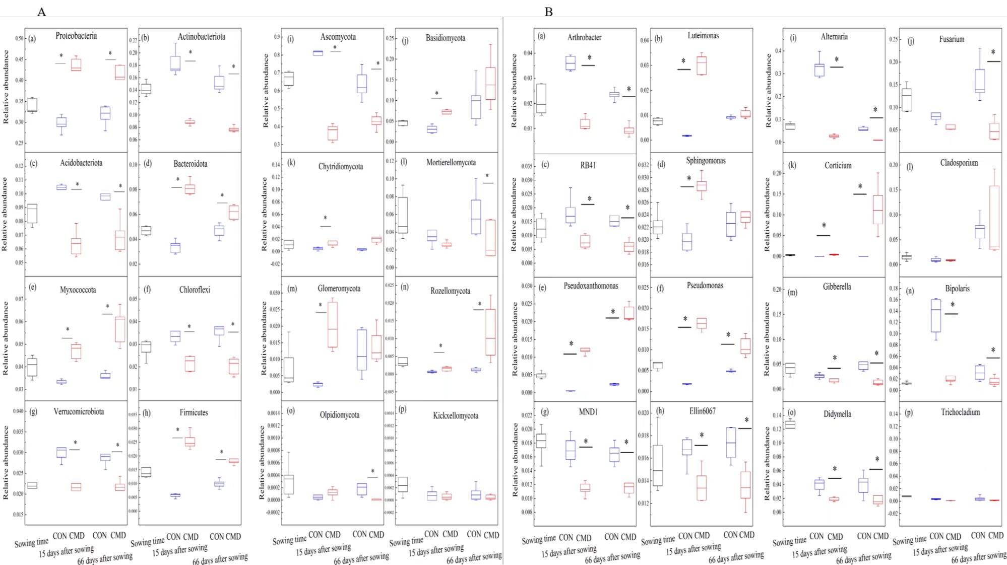 圖1牛糞沉積過程中燕麥根際微生物門水平(A)和屬水平(B)細菌的相對豐度