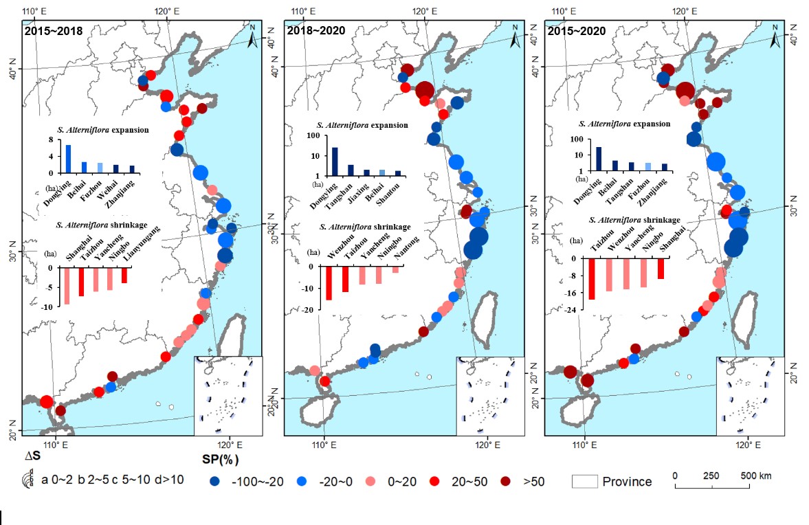 圖1. 2015、2018和2020年中國沿海省份互花草入侵情況(a)、各省互花米草面積變化(c)、各省互花米草占比
