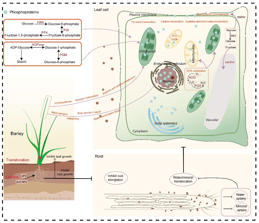 近年來,納米氧化鋅(ZnO NPs)在農業生產中作為納米肥料大量使用。已有研究表明,ZnO NPs能夠增加植物的光合碳同化、水分利用效率和脅迫抗性。然而,ZnO NPs的過量使用會抑制根的生長,改變植物的生理過程,影響植物的生長和產量。另外,納米塑料(nPS)的大量生產與應用也使塑料污染成為世界范圍內的環境問題之一。然而,我們對ZnO NPs和nPS互作對植物生長的影響知之甚少。為此,東北地理所作物生理與栽培學科組研究人員以大麥(Hordeum vulgare)為研究對象,針對ZnO NPs和nPS互作影響大麥蛋白磷酸化的機制展開研究。