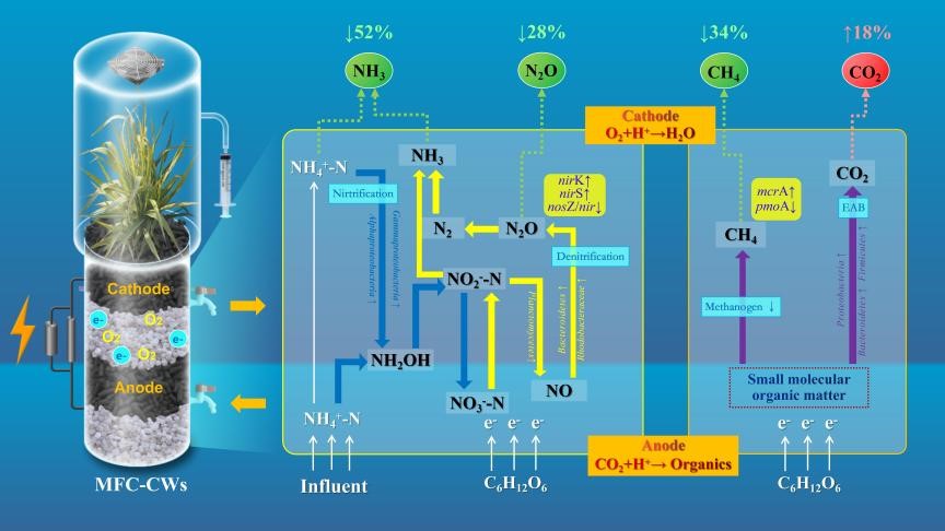 該研究從全新的視角詮釋了微生物燃料電池耦合人工濕地系統(tǒng)的工作機(jī)制與功能,研究成果為同步實(shí)現(xiàn)人工濕地高效水質(zhì)凈化和多種碳氮?dú)怏w減排提供了新的思路,將為“雙碳”戰(zhàn)略目標(biāo)需求背景下低排放型人工濕地的設(shè)計(jì)提供重要的理論依據(jù)和技術(shù)支持。