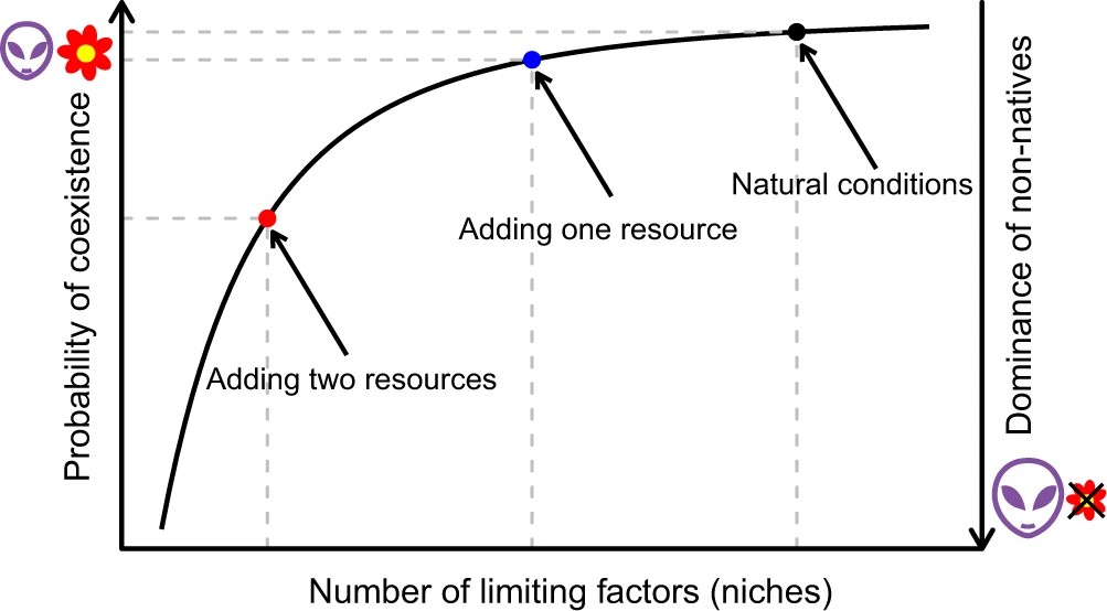 圖1 限制因素數(shù)量對物種共存和生物入侵影響的示意圖。自然條件下,限制因素(生態(tài)位)多,從而促進共存。資源添加會減少限制因素的數(shù)量,從而抑制共存,并促進外來物種的入侵。