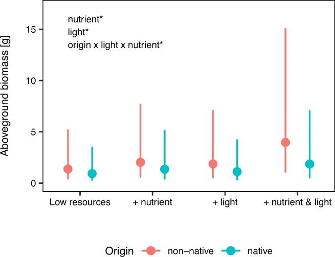 圖2 養(yǎng)分和光照對本地和外來植物競爭結(jié)果(地上生物量)的影響